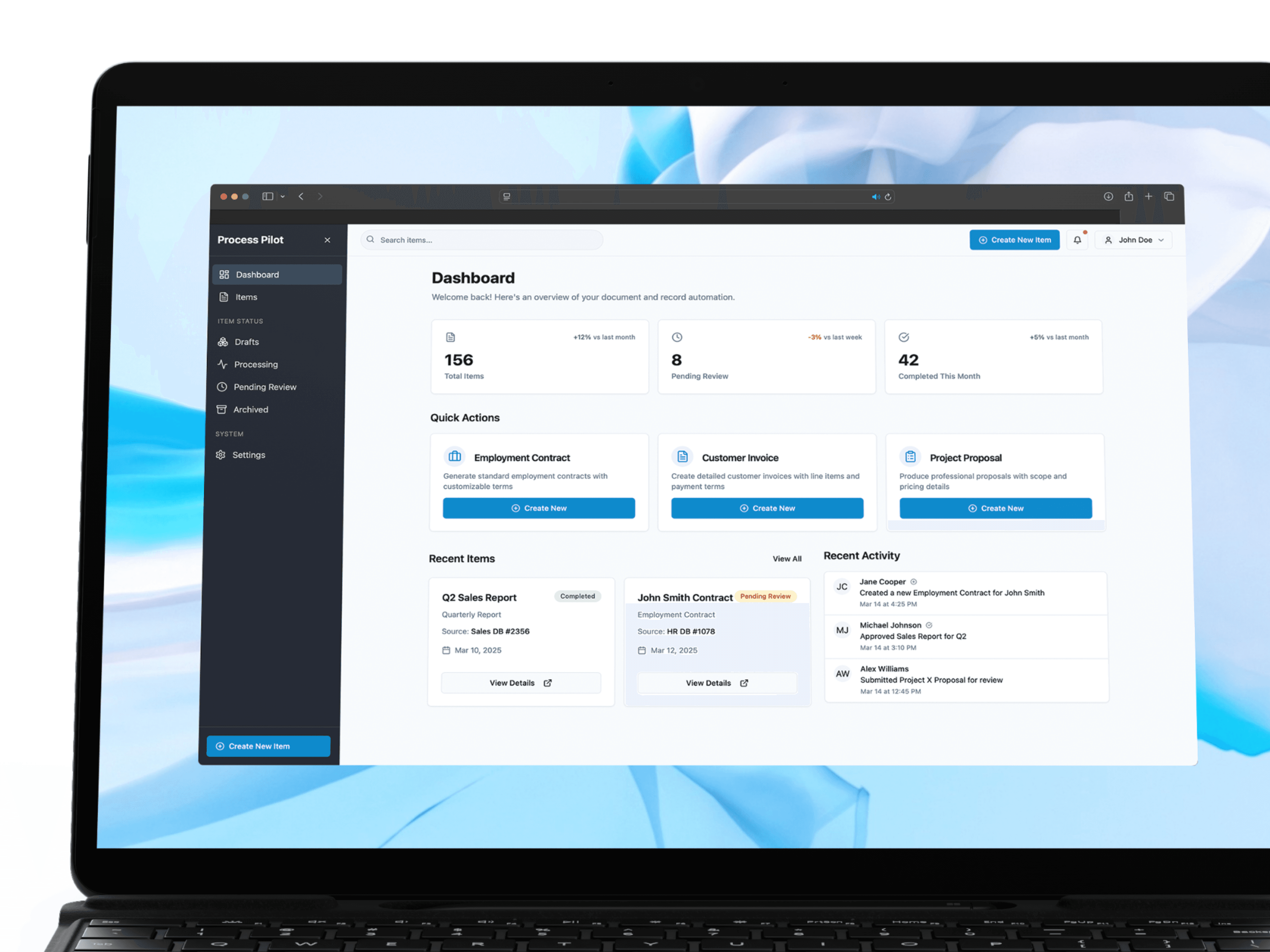 Process Pilot is a streamlined document automation platform engineered to standardise the creation of critical business records
